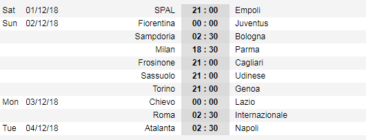 Lịch thi đấu vòng 14 Serie A (Italia)