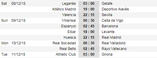 Lịch thi đấu vòng 15 La Liga Tây Ban Nha