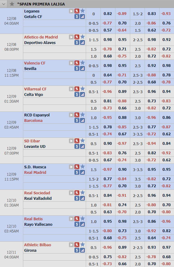 Cập nhật tỷ lệ châu Á vòng 15 La Liga Tây Ban Nha