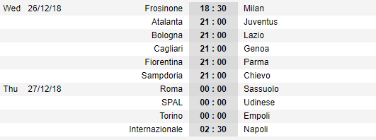 Lịch thi đấu vòng 18 VĐQG Italia