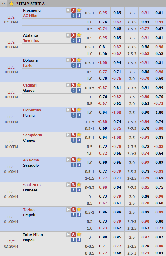 Cập nhật tỷ lệ châu Á vòng 18 VĐQG Italia (Serie A)