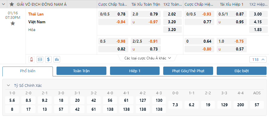 Hiện tại trên sàn giao dịch châu Á, ĐT Thái Lan được đánh giá ở cửa trên với tỷ lệ chấp 1/2 trận này. Mức chấp này cao hơn mức chấp 1/4 của Thái Lan trong cuộc đối đầu tương tự gần nhất diễn ra năm 2019, nhưng đây vẫn là một mức chấp hoàn toàn hợp lý. Bởi ở trận đấu này ĐT Việt Nam sẽ phải chịu sức ép lớn hơn khi cần có bàn thắng dẫn trước.