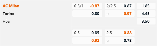AC Milan đang được nhà cái châu Á đánh giá ở cửa trên với tỷ lệ chấp 3/4 và điểm ăn bỏ trên sàn giao dịch. Đây cũng là mức chấp thường thấy trong lịch sử đối đầu của hai đội. Ở cuộc đối đầu tương tự diễn ra các đây 1 tháng trong khuôn cúp QG Italia, AC Milan cũng có tỷ lệ chấp 3/4 nhưng họ đã gây thất vọng khi bị đối thủ cầm hoà với tỷ số 0-0 sau 90 phút thi đấu chính thức và cuối cùng đã thất bại 0-1 trước Torino sau hai hiệp phụ.