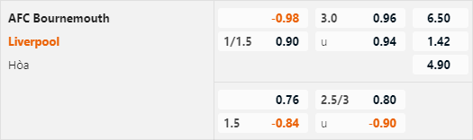 Phân tích tỷ lệ trận Bournemouth vs Liverpool (19h30)