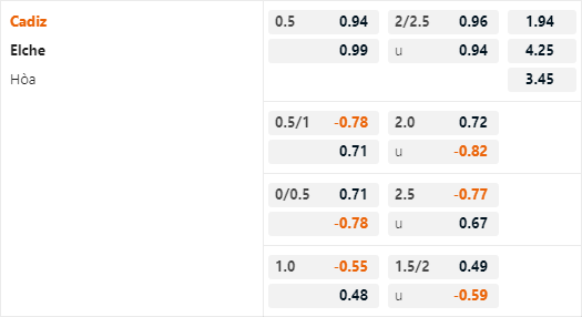 Nhưng đội chủ nhà đã có những tín hiệu tích cực thời gian gần đây, Cadiz đã thắng kèo châu Á 3/4 trận sân nhà gần nhất. Việc đối đầu với Elche lúc này là cơ hội không thể tốt hơn cho đội chủ nhà, có lẽ việc giành điểm từ tay các cầu thủ Elche thời gian này là việc dễ dàng nhất ở giải VĐQG Tây Ban Nha. Với lợi thế sân nhà và thi đấu với quyết tâm cao Cadiz hoàn toàn đủ khả năng giành trận thắng thứ 4 kể từ đấu mùa. Lựa chọn cửa trên sẽ là một lựa chọn hợp lý.
