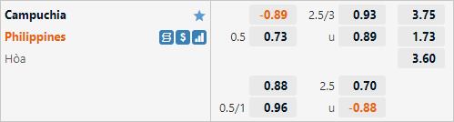 Hiện tại trên sàn giao dịch châu Á Philippines đang được nhà cái đánh giá cao hơn với tỷ lệ chấp 3/4. Có thể thấy Campuchia đã được đánh giá cao hơn rất nhiều so với lần đối đầu gần nhất với Philippines. Ở cuộc đối đầu gần nhất năm 2014 Campuchia đã được đối thủ chấp 2 1/4 và kết thúc trận đấu với thất bại 0-3