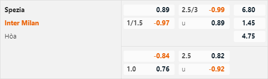 Hiện tại đội khách Inter Milan đang có tỷ lệ chấp 1 1/4 trên sàn giao dịch châu Á. Mức chấp này là tương đối thấp so với lịch sử đối đầu khi Inter Milan có tỷ lệ chấp 1 1/2 ở 2 lần làm khách của Spezia gần nhất. Điều này cho thấy giới chuyên môn không đánh giá cao khả năng thắng đậm của đội khách trận này.