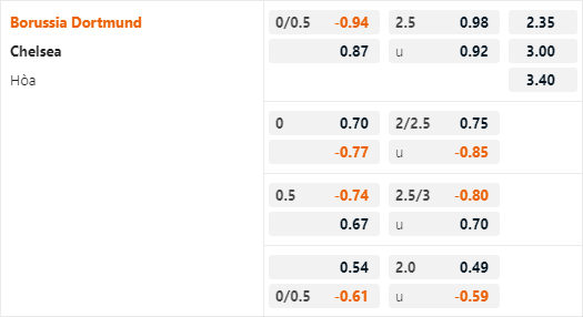 Với lợi thế sân nhà Dortmund đang có tỷ lệ chấp 1/4 trên sàn giao dịch châu Á. Có thể thấy với mức tỷ lệ trận này thì nhà không mấy kỳ vọng vào Chelsea trong trận đấu lượt đi bởi thực tế Chelsea vẫn là đội nhỉnh hơn về mặt lực lượng. Nhưng mức tỷ lệ trận này không vô lý khi đại diện nước Anh không còn duy trì được lối chơi ổn định ở mùa giải này.