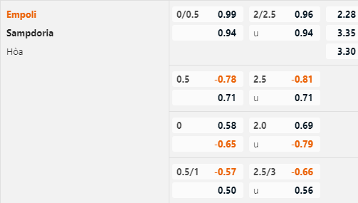 Với lợi thế sân nhà Empoli đang được nhà cái đánh giá cao hơn với tỷ lệ chấp 1/4 và mức điểm ăn cân bằng ở 2 cửa. Điểm đáng chú ý là trận đấu tương tự của mùa giải trước 2 đội được đánh giá tương đồng với mức tỷ lệ 0:0. Điều này cho thấy giới chuyên môn đang đánh giá cao Empoli hơn mùa giải trước.