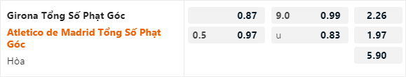 Tỷ lệ tài xỉu phạt góc của trận đấu được nhà cái công khai ở mức 9 hoà, đây là mức tài xỉu tương đối thấp so với mặt bằng chung của giải đấu. Điểm đáng chú ý là 3/5 trận gần nhất của Girona và 4 trận gần nhất của Atletico Madrid đều ghi nhận nhiều hơn 9 tình huống phạt góc.