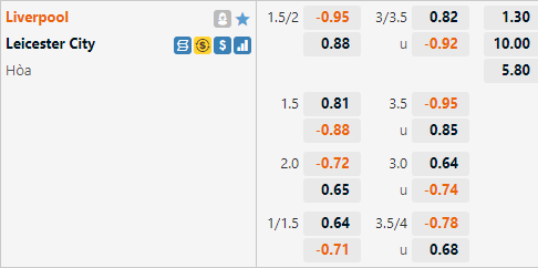 Hiện tại trên sàn châu Á Liverpool đang có tỷ lệ chấp 1 3/4, đây không phải là mức chấp quá cao của đội chủ nhà bởi họ đã từng chấp Leicester 2 hoà trong cuộc đối tương tự của mùa giải trước. Nhưng với việc Liverpool bị ảnh hưởng về mặt lực lương hơn rất nhiều Leicester trong đợt World Cup vừa qua thì mức chấp 1 3/4 vẫn là một mức chấp cao của cửa trên.