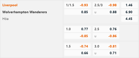 Thời điểm hiện tại nhà cái châu Á đang công khai mức chấp 1 1/4 và điểm ăn bỏ của Liverpool trên sàn giao dịch. Mức chấp này coi như tương đương với mức chấp 1 hoà và điểm ăn ít của cửa trên, điểm đang chú ý là mức chấp trận này rất thấp nếu so với 2 cuộc đối đầu tương tự gần nhất. Ở 2 lần đón tiếp Wolves gần nhất các cầu thủ Liverpool đều có tỷ lệ chấp từ 2 hoà.