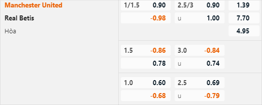 Hiện tại Man Utd được nhà cái đánh giá ở cửa trên với tỷ lệ chấp 1 1/4, mức chấp này cho thấy giới chuyên môn đang đánh giá rất cao Man Utd. Bởi ở cuộc đối đầu gần nhất diễn ra cuối năm 2022 các cầu thủ Betis còn được đánh giá ở cửa trên với tỷ lệ chấp 1/4.