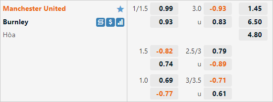 Trên sàn giao dịch châu Á hiện tại Man Ut đang được nhà cái đánh giá ở cửa trên với tỷ lệ chấp 1 1/4 trận này. Đây cũng là mức chấp thường thấy của Quỷ đỏ khi tiếp đón Burnley trong quá khứ. Ở 2 trận đấu tương tự gần nhất Man Utd đều có tỷ lệ chấp 1 1/4 và đều dễ dàng vượt kèo châu Á với cùng tỷ số 3-1.