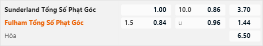 Tỷ lệ tài xỉu phạt góc của trận đấu được công khai ở mức 10 hoà và điểm ăn tương đối cân bằng. Mức tài xiu này hoàn toàn hợp lý và không có bất thường. Theo thống kê gần đây thì có tới 4/5 trận gần nhất của Sunderland ghi nhận nhiều hơn 10 tình huống phạt góc, điều này cho thấy lối chơi của đội chủ nhà tạo ra nhiều tình huống phạt góc.