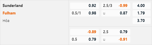 Fulham cũng đang rất cần một trận thắng thuyết phục giai đoạn này sau 4 trận liên tiếp chỉ hoà và thua. Việc đối đầu với Sunderland lần này cũng có thể coi là một cơ hội tốt để các cầu thủ khách có được chiến thắng củng cố tinh thần. Với mức tài xỉu 2 3/4 nhà cái đưa ra trận này thì lựa chọn cửa tài là lựa chọn đáng chú ý nhất ở kèo tài xỉu.