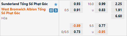 Tỷ lệ tài xỉu phạt góc của trận đấu được công khai ở mức 10 hoà. Đây có lẽ là mức tài xỉu hơi nhỉnh hơn so với mặt bằng chung của giải đấu nhưng hoàn toàn phù hợp với dự đoán trận đấu khó diễn ra sôi nổi. Theo thống kê thì cả 3 trận đấu gần nhất của West Brom đều kết thúc với ghi nhận không dưới 12 tình huống phạt góc 1 trận. Phía bên kia Sunderland cũng ghi nhận nhiều tình huống phạt góc ở 3 vòng đấu gần nhất (2 trận 10 tình huống, 1 trận 9). Rất có thể trận đấu này cũng không phải là một ngoại lệ.