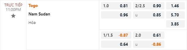 Togo bất bại kèo tới 6/7 trận đấu vừa rồi có cược chấp châu Á. Cũng theo TLCA, South Sudan thua kèo tới 6/8 trận đấu gần nhất có trên sàn giao dịch châu Á.