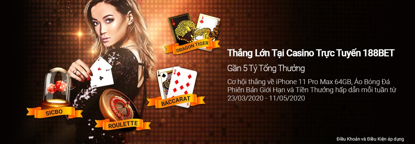 Hãy Đăng ký tài khoản 188BET sau đó tha hồ tham gia chơi cá cược online với các sản phầm giải trí đa dang. Hiện nay 188BET đang có chương trình khuyến mãi Gần 5 Tỷ Tổng Thưởng Thắng Lớn Tại Casino Trực Tuyến 188BET –. Khuyến mãi diễn ra từ ngày 23/03/2020 đến ngày 11/05/2020, nhanh tay tham gia cùng 188BET nhé!