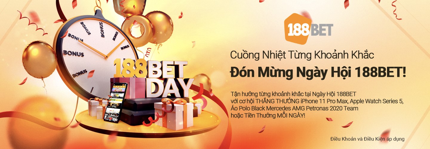 Hãy Đăng ký tài khoản 188BET sau đó tha hồ đưa ra các dự đoán của mình và có cơ hội thắng lớn với các cược đó. Chào đón ngày hội 188BET với chương trình khuyến mãi Cuồng Nhiệt Từng Khoảnh Khắc Đón Mừng Ngày Hội 188BET! Quý Khách chỉ cần đặt các cược hợp lệ sẽ có cơ hội nhận thưởng hằng ngày. THAM GIA NGAY!