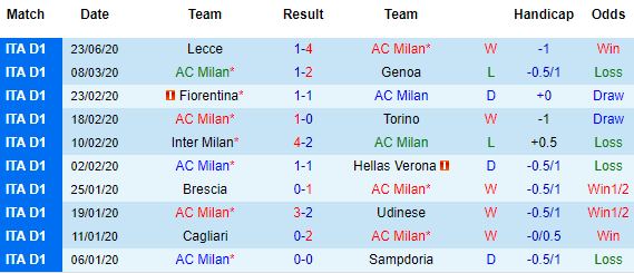 Bảng kèo 10 vòng gần nhất của AC Milan