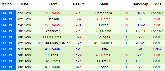 Bảng kèo 10 vòng gần nhất của AS Roma