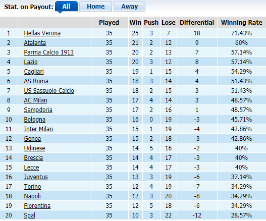 Nếu xét trên phương diện chỉ số châu Á, từ đầu mùa Atalanta có tỷ lệ thắng kèo cao hơn AC Milan. Trong 35 vòng đã qua, Atalanta thắng tỷ lệ 21 trận, đạt 60% còn AC Milan vượt rào cản handicap 17 trận, tương đương với tỷ lệ 48,57%. Trên sân nhà, AC Milan chơi không tốt khi chỉ có tỷ lệ thắng kèo là 35,29% trong khi Atalanta thắng tỷ lệ 70,59% số trận sân khách mùa này.