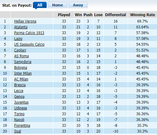 Những kết quả ấn tượng thời gian gần đây cải thiện rất nhiều thành tích trên bảng kèo châu Á của AC Milan. Đội bóng áo sọc đỏ đen đã có tỷ lệ thắng kèo đạt 45,45%, ngang bằng với những gì Bologna làm được từ đầu mùa. Nhưng AC Milan chơi không tốt trên sân nhà khi đứng tận thứ 18 về tỷ lệ thắng kèo với chỉ 31,25%.