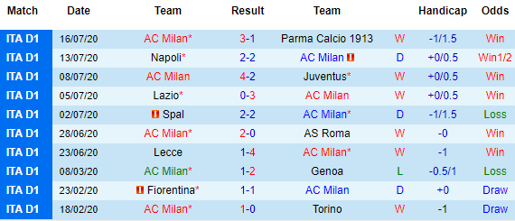 Bảng kèo 10 vòng gần nhất của AC Milan