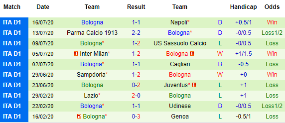Bảng kèo 10 vòng gần nhất của Bologna