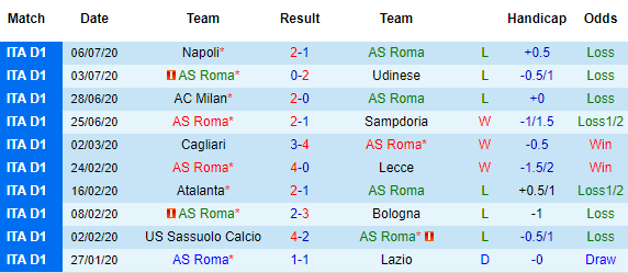 Bảng kèo 10 vòng gần nhất của AS Roma
