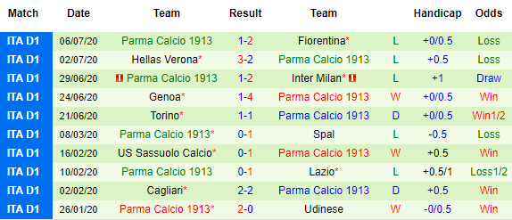 Bảng kèo 10 vòng gần nhất của Parma