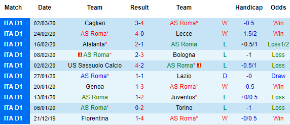 Bảng kèo 10 trận gần nhất của AS Roma tại Serie A