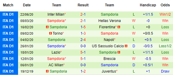 Bảng kèo 10 trận gần nhất của Sampdoria tại Serie A