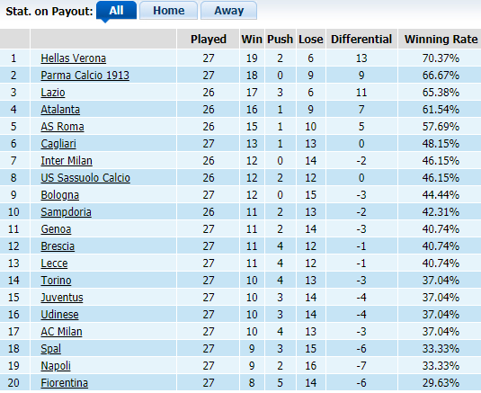 Trong số những ông lớn của Italia thì 2 CLB thủ đô là Lazio và AS Roma có tỷ lệ thắng kèo khá cao, nhỉnh hơn nhiều so với những Juventus, Napoli, Inter Milan. AS Roma đứng thứ 5 ở BXH kèo với tỷ lệ vượt rào cản handicap là 57,69%. Trong khi đó, đối thủ ngày hôm nay của họ - Sampdoria xếp thứ 10 ở góc độ tỷ lệ thắng kèo với 42,31%.