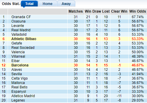 Trên BXH tỷ lệ, Blaugrana chỉ có vị trí thứ 12 với 46,67%, trong khi đối thủ Bilbao sở hữu tỷ lệ thắng kèo là 53,33% và xếp thứ 6. Vậy nhưng cũng không thể coi thường Barca bởi họ vẫn chơi khá ổn tại Camp Nou. Trên sân nhà, Messi và đồng đội có 60% số trận thắng kèo châu Á, trong khi Bilbao vốn dĩ chơi không quá ấn tượng khi rời xa San Mames. Bilbao chỉ có tỷ lệ thắng kèo sân khách là 46,67%.