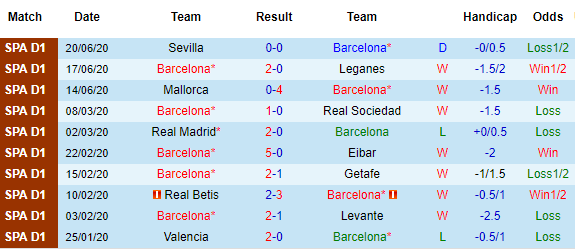 Bảng kèo 10 trận gần nhất của Barca tại La Liga
