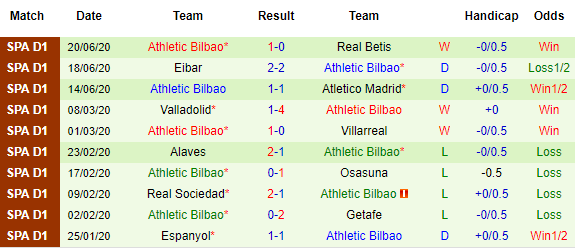 Bảng kèo 10 trận gần nhất của Bilbao tại La Liga