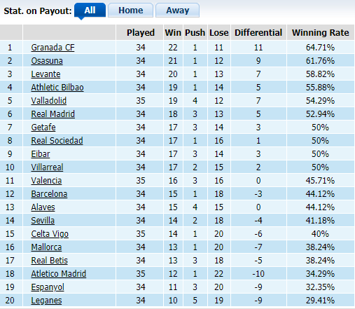 Barcelona dù thi đấu thiếu ấn tượng ở mùa giải năm nay nhưng có tỷ lệ thắng kèo còn cao hơn cả Espanyol. Đội chủ sân Camp Nou có tỷ lệ thắng kèo đạt 44,12% trong khi CLB cùng thành phố chỉ có 32,35% tỷ lệ thắng kèo. Trên sân nhà, Barca vượt qua rào cản handicap ở 9/17 vòng đã qua, đứng thứ 5 ở BXH kèo sân nhà với tỷ lệ 52,94%.