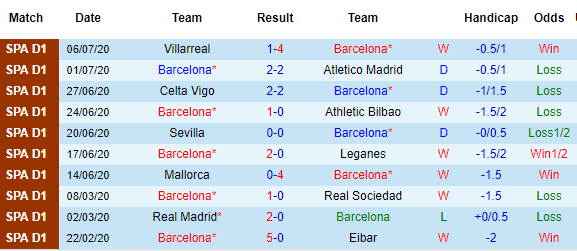 Bảng kèo 10 vòng gần nhất của Barca