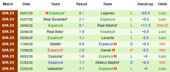 Bảng kèo 10 vòng gần nhất của Espanyol