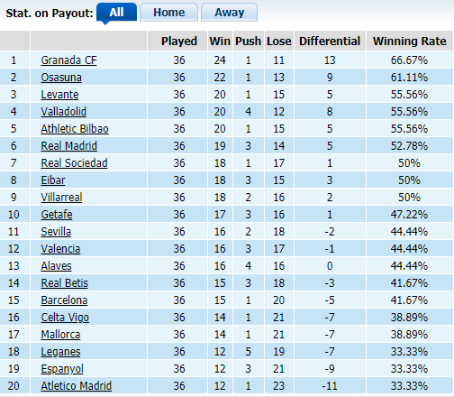 Như nhiều mùa giải trước, Barca dù luôn nằm trong top 2 nhưng trên BXH kèo thì họ lại thuộc nửa dưới. Sau 36 trận, gã khổng lồ xứ Catalan thắng kèo 15 lần, đạt tỷ lệ 41,67% và xếp thứ 15 ở BXH kèo tổng. Còn Osasuna, họ đứng thứ 2 trên góc độ chỉ số châu Á với tỷ lệ thắng kèo lên tới 61,11%, tương đương với việc họ vượt kèo châu Á 22/36 vòng đã qua.
