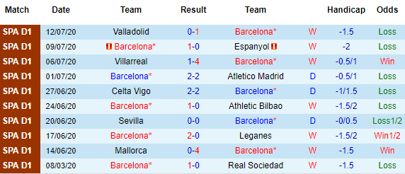 Bảng kèo 10 vòng gần nhất của Barcelona