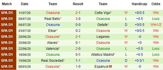 Bảng kèo 10 vòng gần nhất của Osasuna