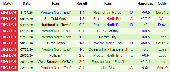 Bảng kèo 10 vòng gần nhất của Preston North End