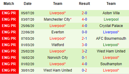 Bảng kèo 10 vòng gần nhất của Liverpool