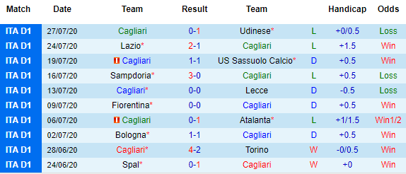 Ở BXH kèo sân nhà, Cagliari đứng thứ 10 với tỷ lệ 44,44%, tương đương với việc họ vượt rào cản handicap 8/18 vòng tiếp khách từ đầu mùa. Trong khi đó, Juventus đứng tận thứ 18 ở BXH kèo sân khách với tỷ lệ chỉ là 27,78%. 10 vòng gần nhất, nếu như Cagliari thắng kèo 7, thua kèo 3 thì Juventus thắng tỷ lệ 5 và cũng thua kèo 5 trận. 10 lần đối đầu gần đây giữa đôi bên Juventus thắng chỉ số châu Á 7 lần và thua kèo 2 trận.
