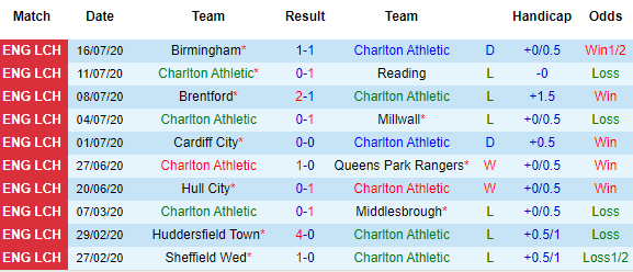 Bảng kèo 10 vòng gần nhất của Charlton
