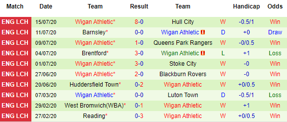 Bảng kèo 10 vòng gần nhất của Wigan