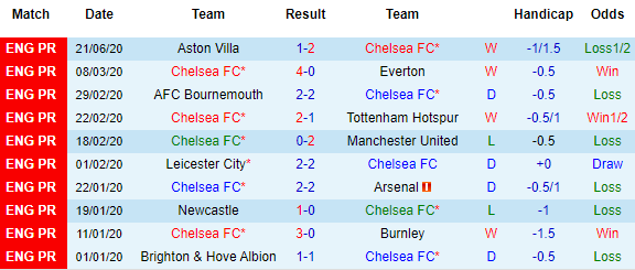 Bảng kèo 10 vòng gần nhất của Chelsea